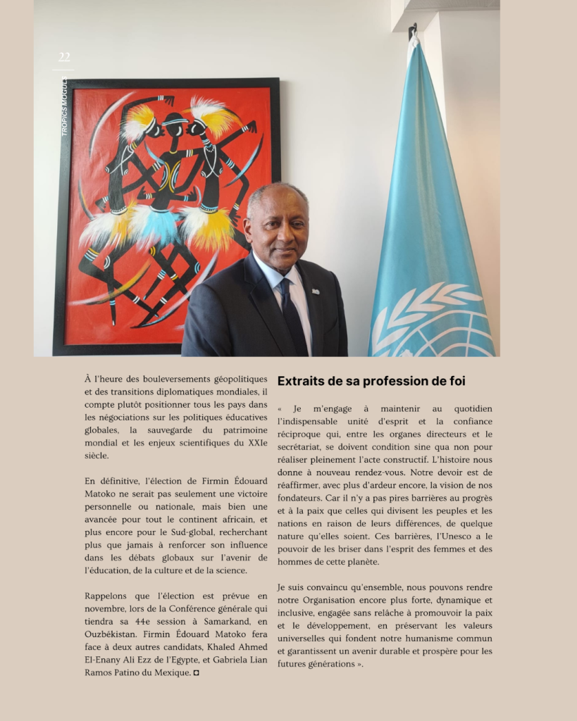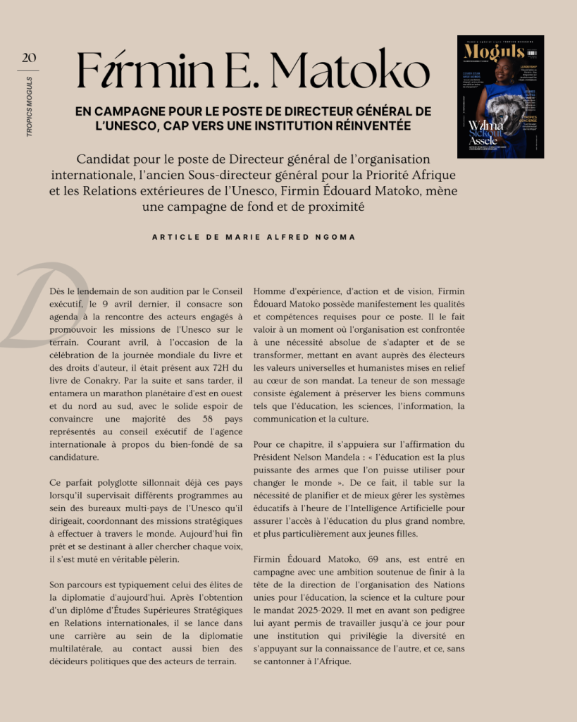 TRIBUNE HOMMAGE (Tropics Media Group) – Dans les couloirs feutrés de l’UNESCO, où se tissent les fils invisibles de la culture, de l’éducation et de la science mondiales, la candidature de l’Ambassadeur Firmin Édouard Matoko à la direction générale en 2025 n’a pas été qu’une simple ambition personnelle. Elle a incarné l’écho poignant d’un continent trop souvent relégué aux marges des décisions globales : l’Afrique subsaharienne, avec sa vitalité créative et son potentiel inexploité. Matoko, diplomate congolais chevronné, a porté haut les couleurs de la République du Congo, démontrant comment le soft power africain, cette force douce faite de culture, de solidarité et d’innovation, peut rayonner sur la scène internationale, défiant les inégalités et inspirant un multilatéralisme plus inclusif.